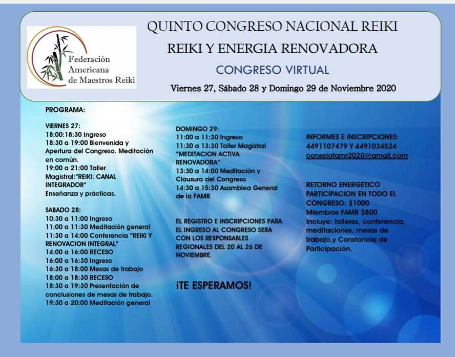 El pasado mes de Noviembre, la Federación Americana de Maestros Reiki celebró su Quinto Congreso Nacional Reiki, transmitido vía online desde la ciudad de Aguascalientes. Gracias a todos los participantes aquí compartimos algunas imágenes y nos vemos en el próximo congreso.